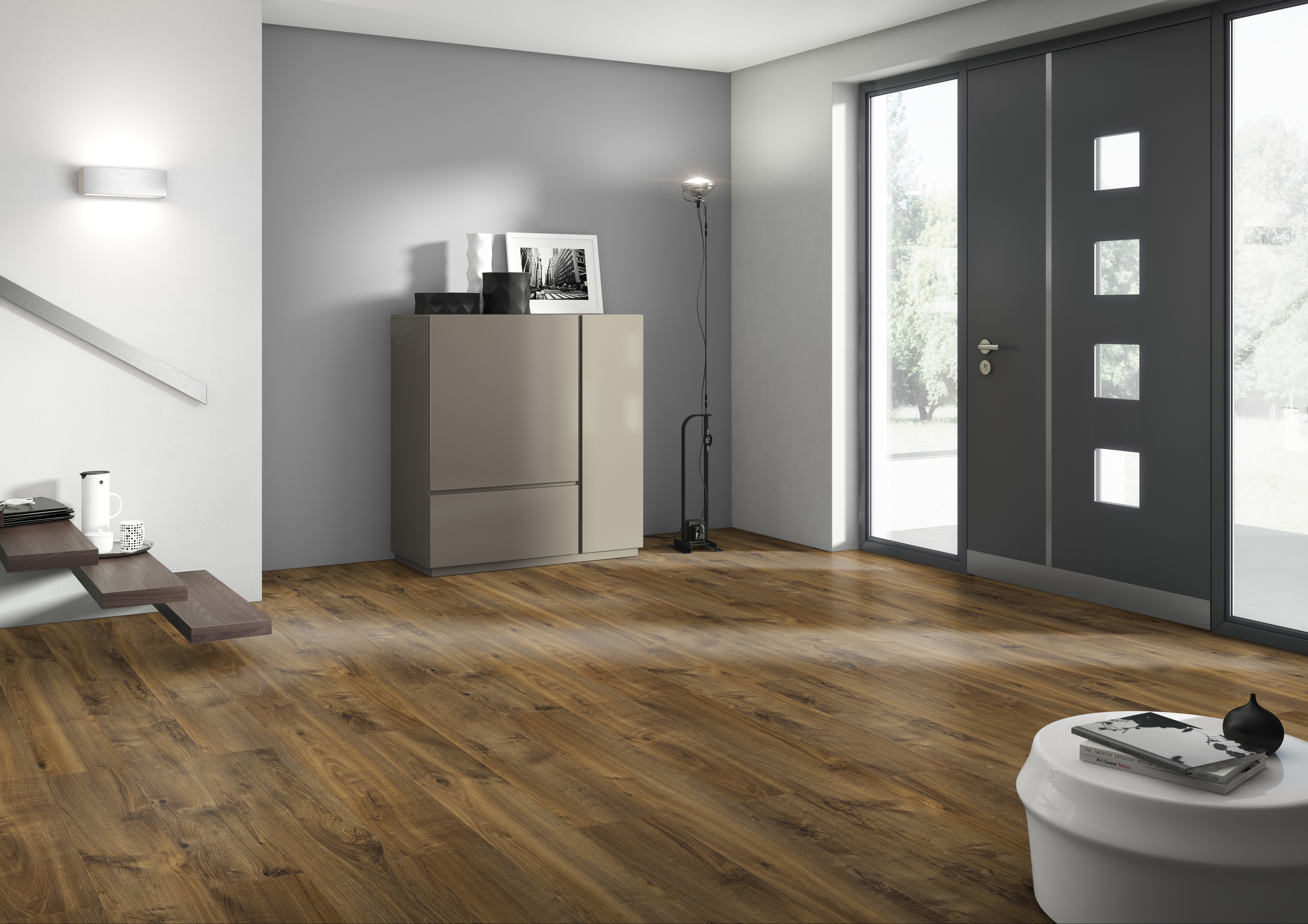 PISO LAMINADO Dale vida a cualquier lugar de tu hogar u oficina creando espacios cálidos con pisos que tienen la apariencia de madera natural. Por su gran variedad de texturas y colores, nuestros pisos laminados son la mejor opción para darle un toque único a cada espacio de tu hogar u oficina. Características: • Los pisos laminados tienen cuatro capas: • La capa protectora: La capa protectora evita manchas y decoloración. • La capa de diseño: La capa de diseño que es, literalmente una imagen fotográfica de la madera, piedra u otro elemento natural. • La capa central o interna: La capa interna, hecha de resina plástica, mantiene el laminado estable y plano. • La capa de soporte: La capa de soporte previene que la humedad deforme los pisos. • Fáciles de limpiar. • Resistentes.